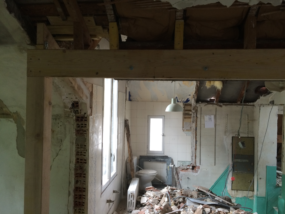 - Démolition d’un mur porteur, de cloisons et reprise de la structure de la charpente